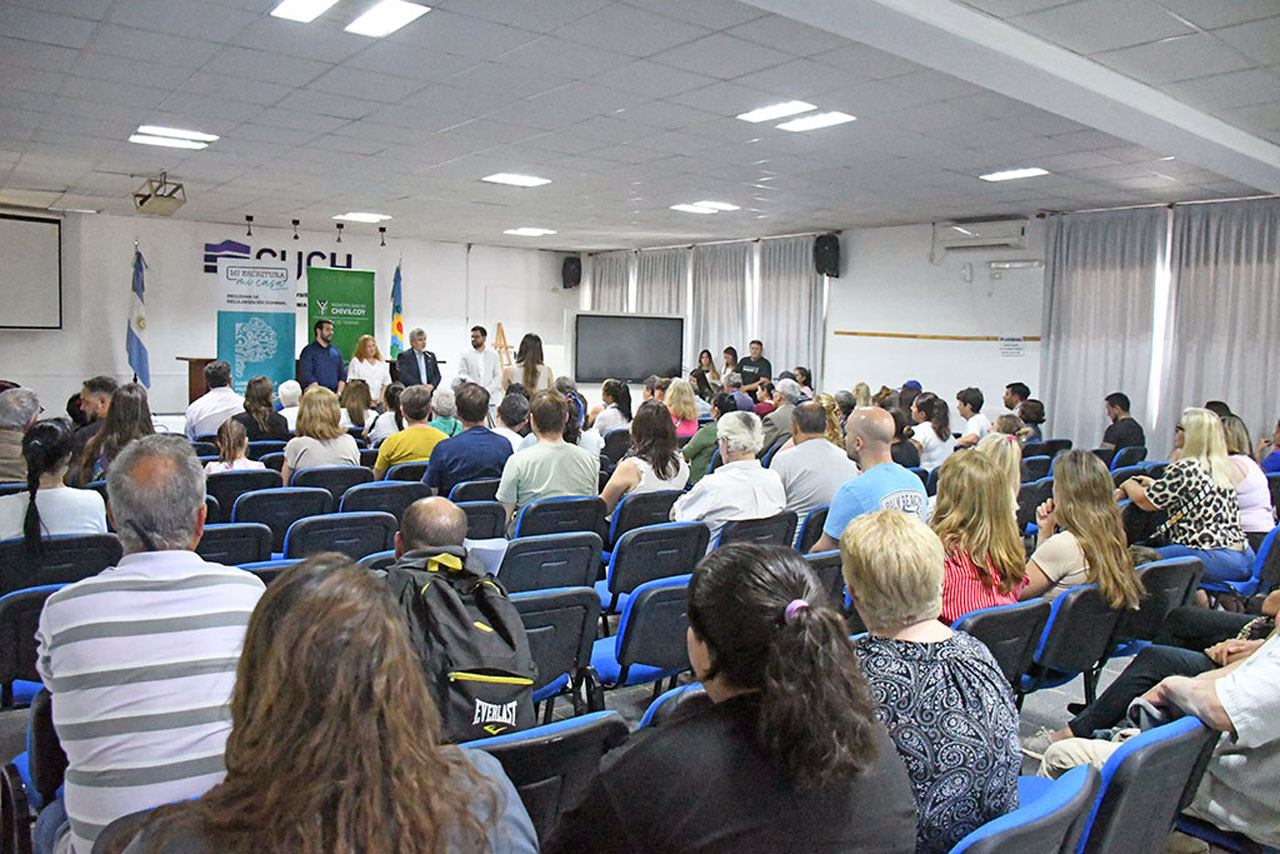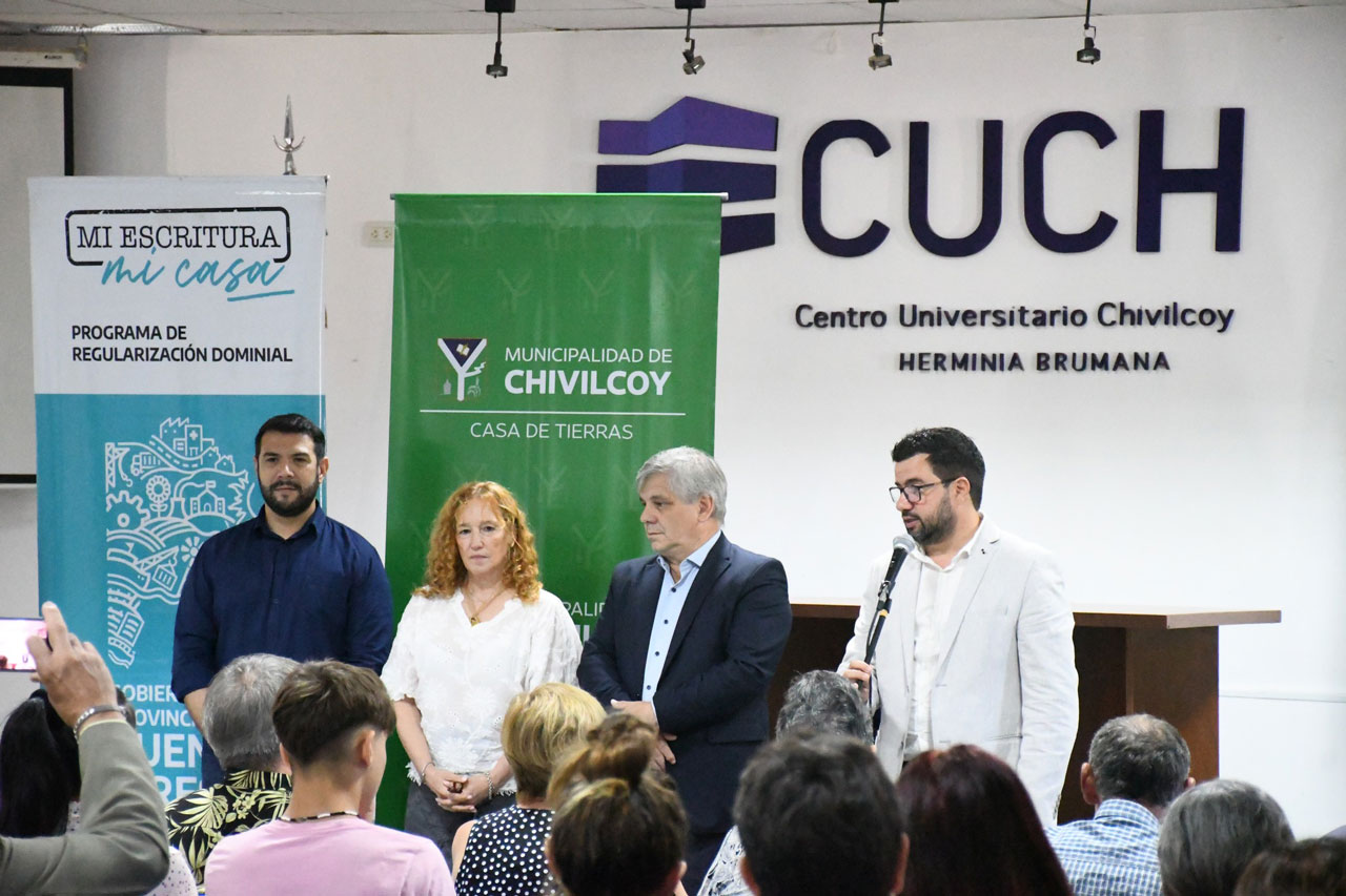 El intendente Guillermo Britos, junto a autoridades provinciales, encabezó este jueves el acto en que 79 familias de Chivilcoy procedieron a la firma de los títulos de propiedad de sus viviendas. La actividad tuvo lugar en el salón de actos del CUCH.