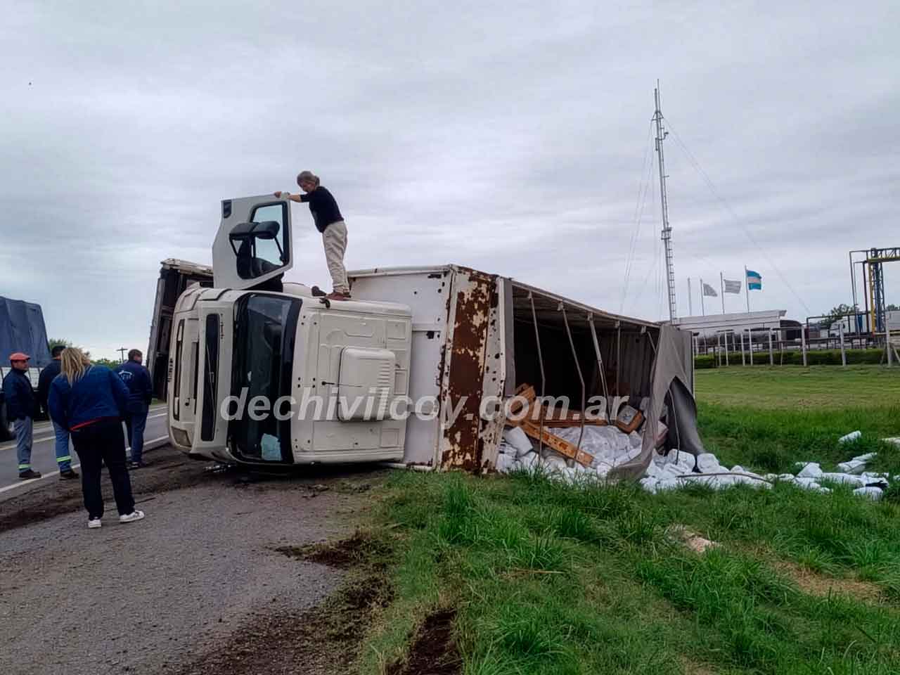 En la tarde de hoy se produjo un accidente vehicular en la Ruta Nacional 5, en el kilómetro 161,300. Por causas que aún se tratan de establecer, un camión Volvo VM260 de color blanco, patente LDX-760, que arrastraba un acoplado marca Montenegro, patente MZO-305 que llevaba una carga de agroquímicos, perdió el control, despistó y volcó.