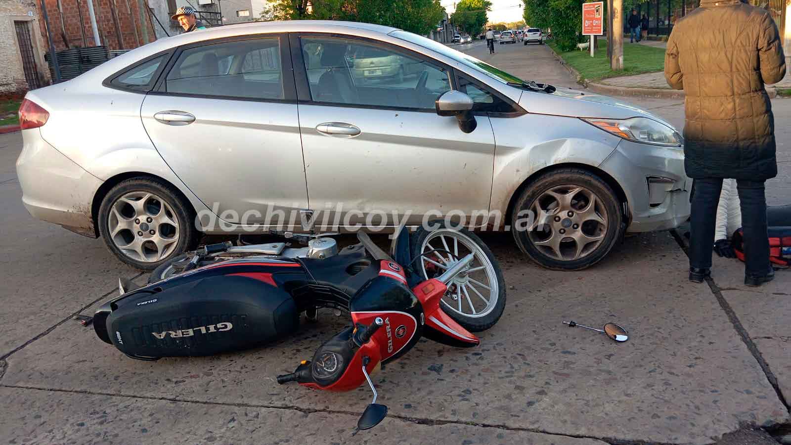 En el lugar mencionado colisionaron un auto Ford Fiesta Kinetic, que era conducido por María de los Ángeles Benítez y una moto Gilera110 c.c. en la que circulaba Valeriana Rodas Barrios quien sufrió traumatismo de miembro inferior.