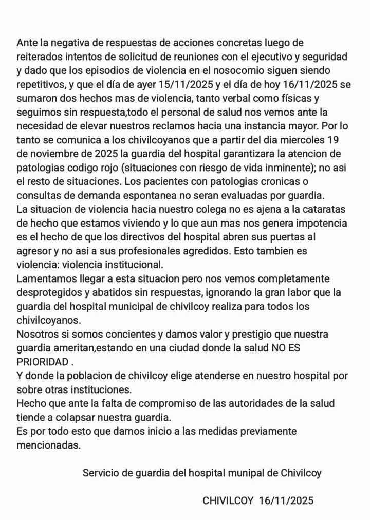 Frente a este escenario, y después de que múltiples solicitudes de reuniones no obtuvieran resultados, los médicos de guardia informaron que a partir del miércoles 19 de noviembre la atención quedará restringida únicamente a casos de “código rojo” o riesgo de vida. Por consiguiente, los pacientes con patologías crónicas o aquellos que acuden por consultas de demanda espontánea no serán atendidos en la guardia.