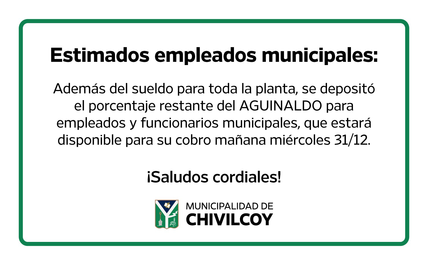 El intendente Guillermo Britos informó que ya se encuentra depositado el sueldo correspondiente al mes de diciembre para toda la planta de trabajadores municipales, junto con el porcentaje restante del aguinaldo para empleados y funcionarios, que estará disponible para su cobro el miércoles 31 de diciembre.