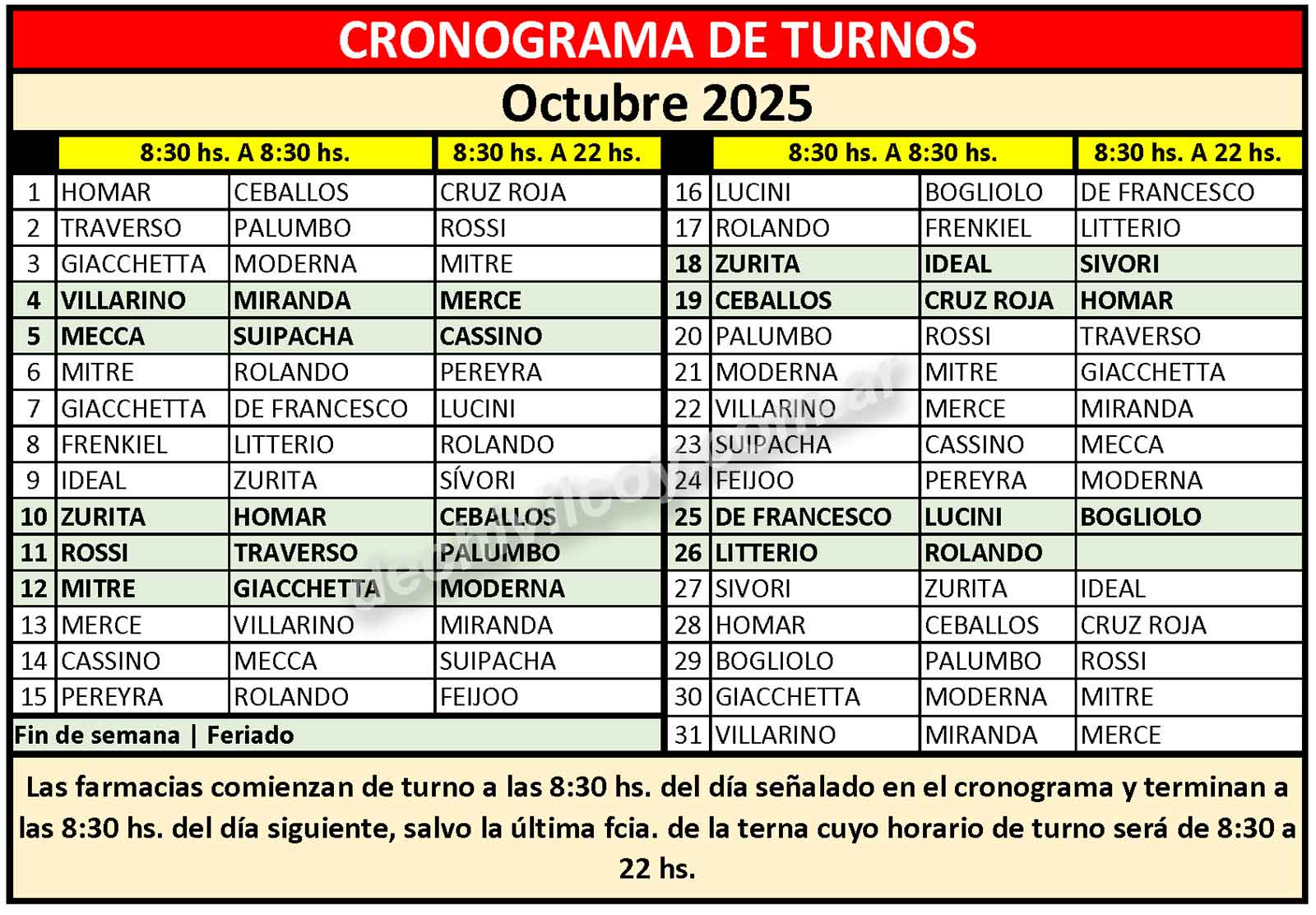 Las farmacias comienzan el turno a las 8.30 hs. del día señalado en el cronograma y terminan a las 8.30 hs. del día siguiente, salvo la última farmacia de la terna cuyo horario de turno será de 8.30 a 22 hs.