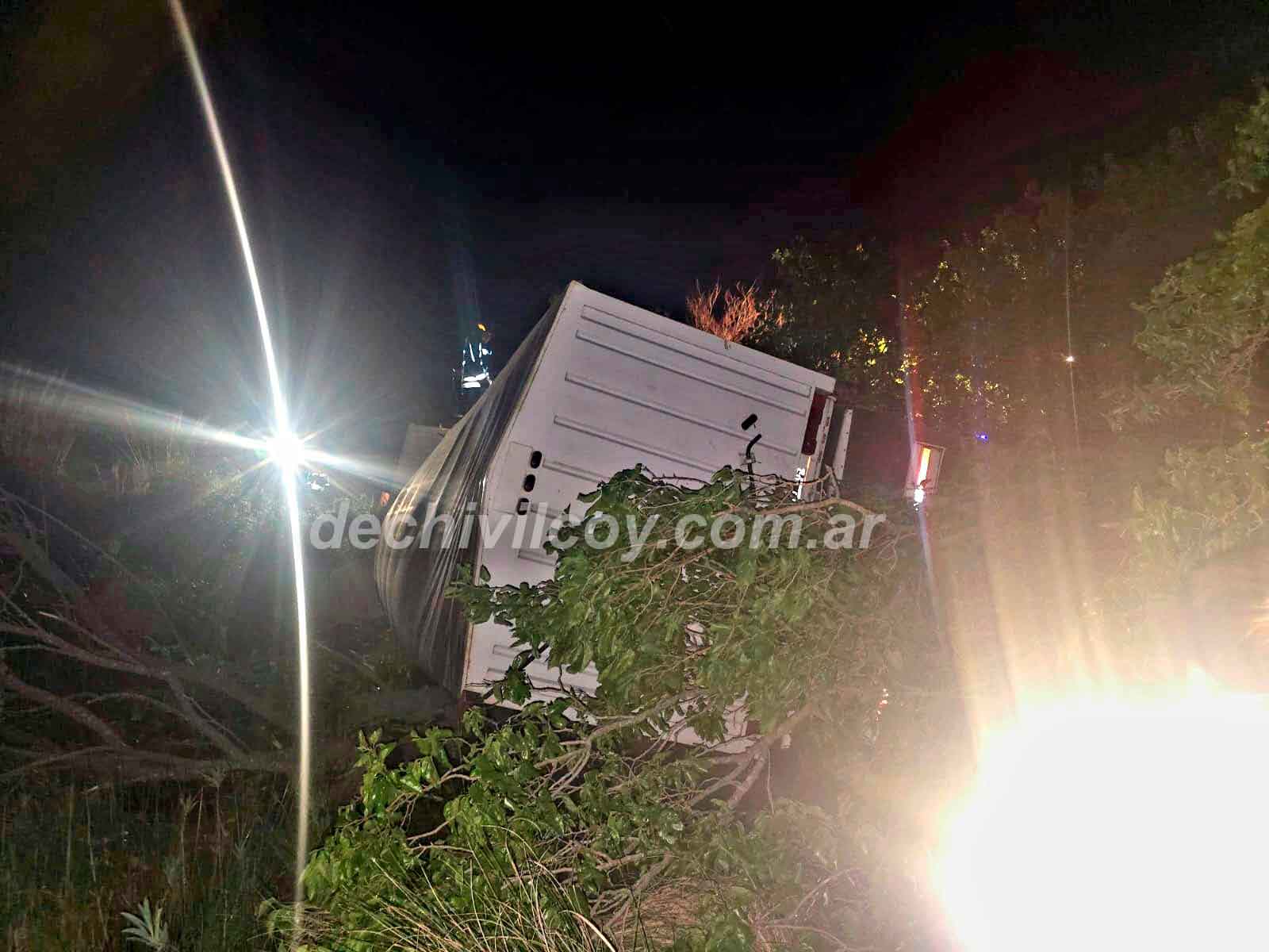 Aproximadamente a las 18.30 horas de este jueves, se produjo un lamentable siniestro vial en la Ruta Nacional 5, a la altura del kilómetro 180,500, en Chivilcoy. Un camión Ford Cargo, que arrastraba una tolva cargada de soja, volcó y quedó sobre la zona de préstamo, en un sector con agua acumulada.