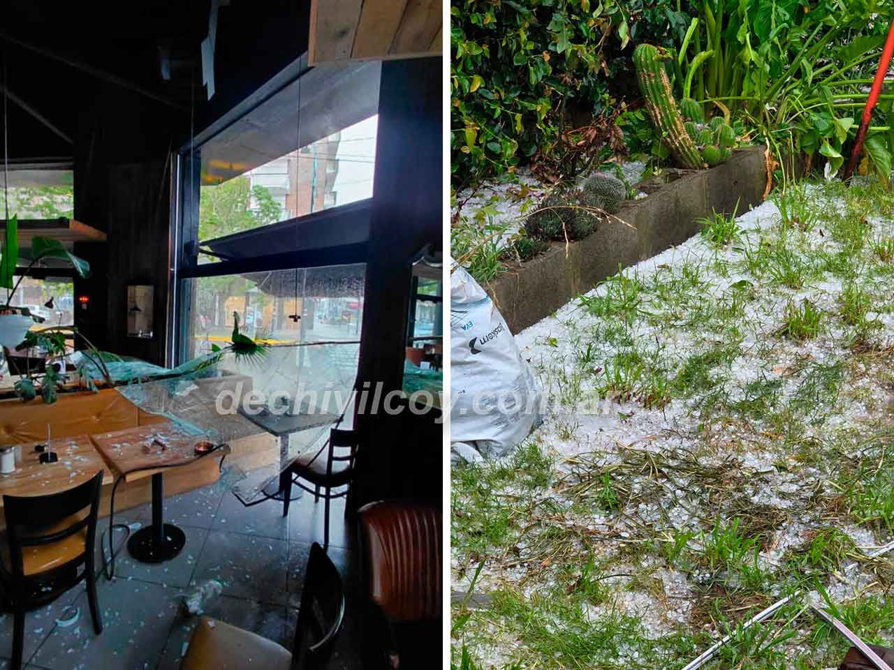 Uno de los hechos más impactantes fue la caída de un árbol en la Plaza España, que aplastó varios autos estacionados en el lugar. También se reportó la rotura de vidrios en Olivo, en la esquina del local, como consecuencia de la presión del viento.