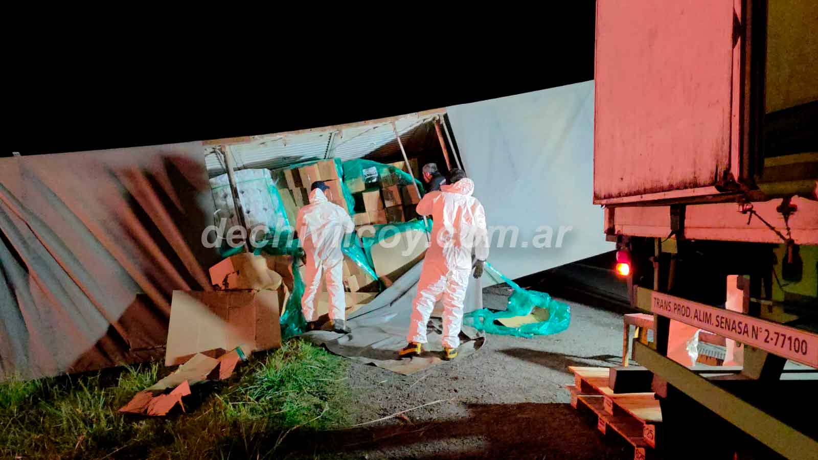 Un importante operativo se desarrolló este lunes en el kilómetro 161,300 de la Ruta Nacional 5, frente a la planta de la empresa láctea Las Tres Niñas, luego del vuelco de un camión que transportaba productos fitosanitarios.