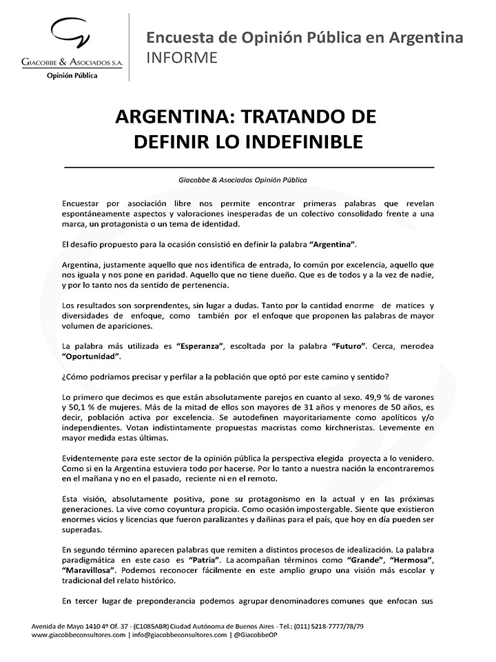 Informe confeccionado por la Consultora Giacobbe & Asociados: “Defina con una sola palabra a la República Argentina”, elaborada entre el 25 y el 27 de febrero de 2017.