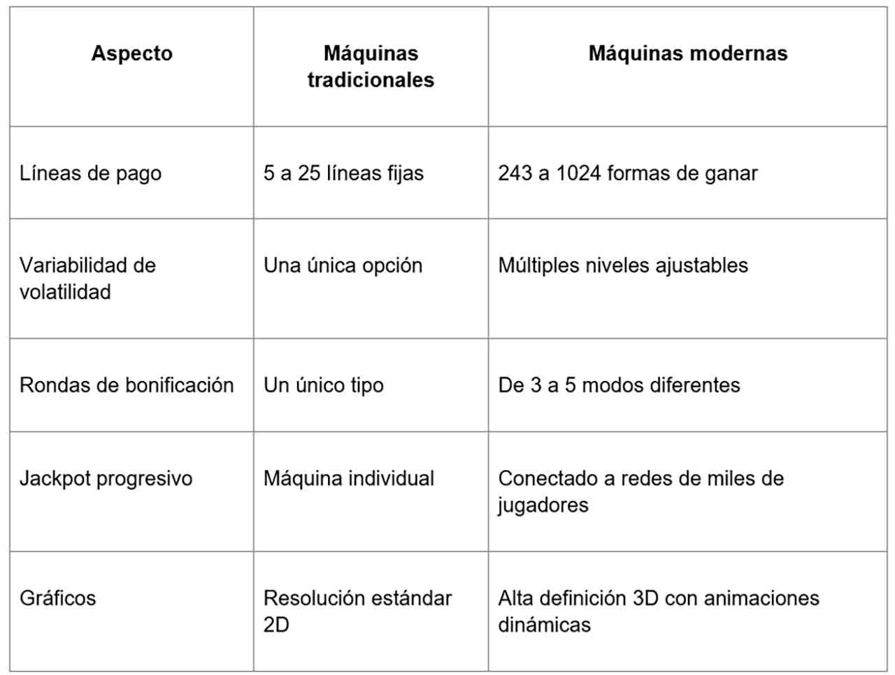 La tabla siguiente muestra las diferencias operativas entre máquinas tradicionales y los nuevos modelos implementados en plataformas contemporáneas: