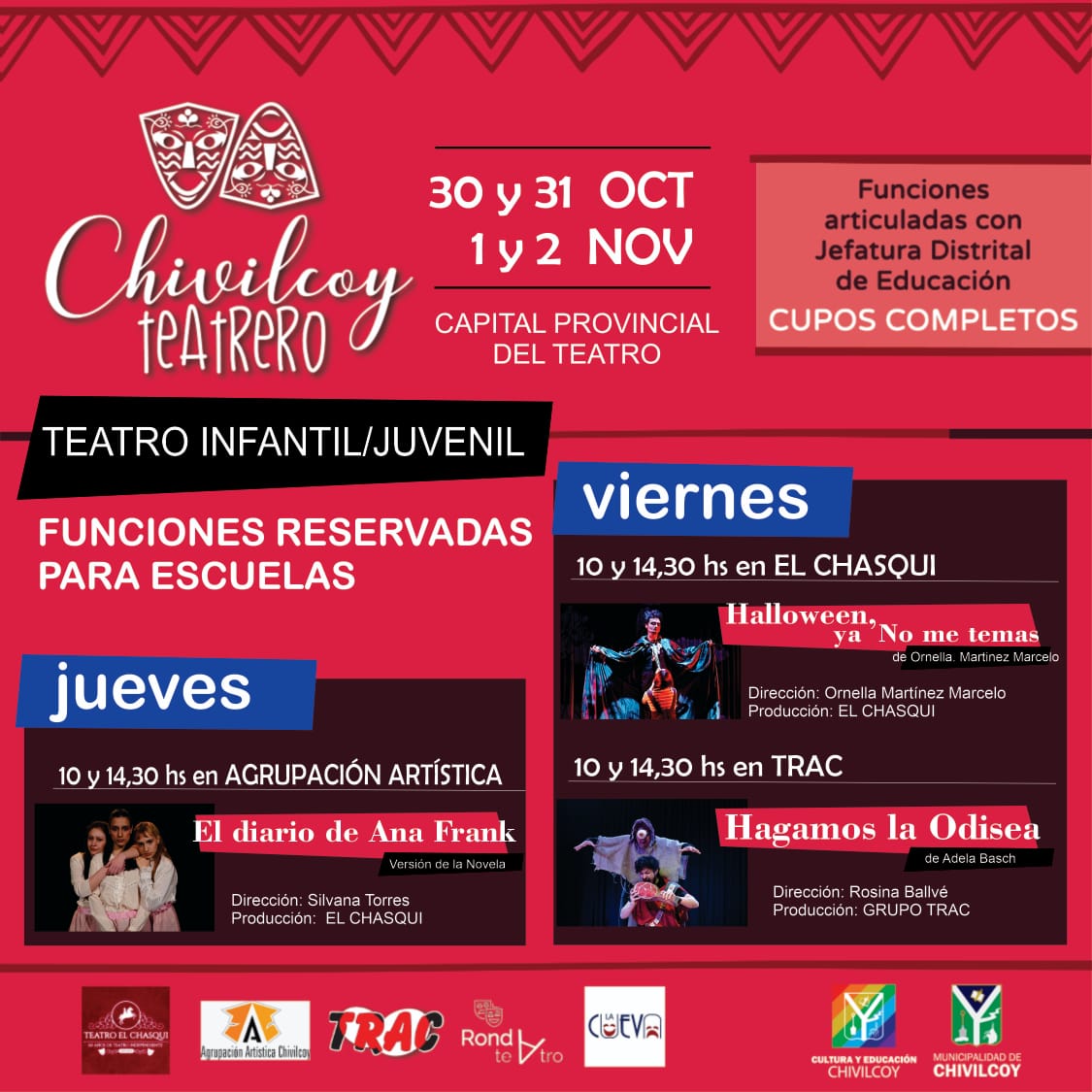 Por su parte, Diego Scarpellino dijo que “Este evento lo realizamos hace ya 10 años. Son 16 funciones que se van a realizar en estos cuatros días, incluyendo obras infantiles y para adultos. Además, contamos con la Jefatura Distrital que organiza para que puedan asistir las diferentes escuelas primarias y secundarias públicas de Chivilcoy”.