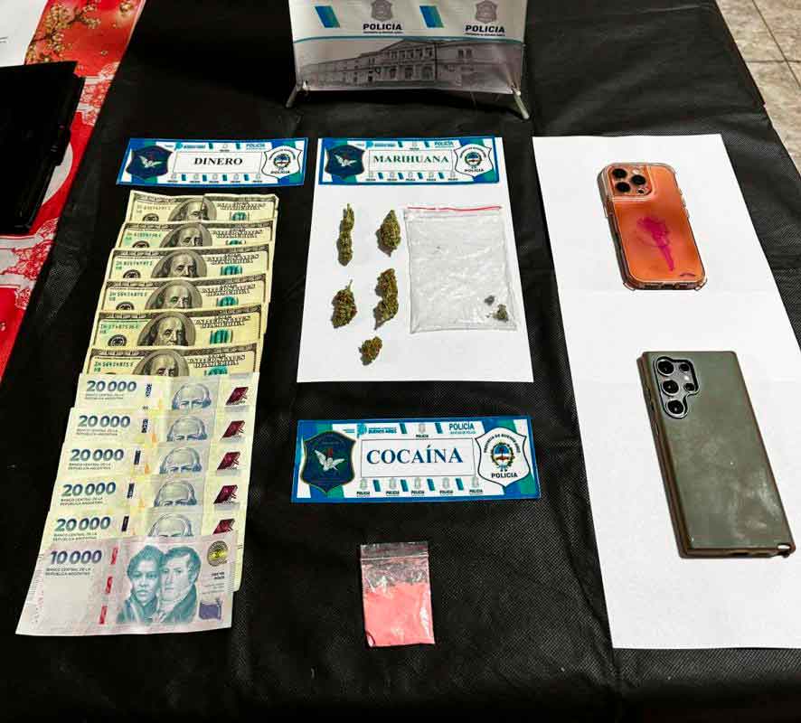 Ante la situación, y con la debida urgencia, el personal policial efectuó un registro preventivo del vehículo y de las pertenencias de los involucrados. En el interior de la guantera se halló un envoltorio tipo ziploc con sustancia pulverulenta de color rosado, reconocida como tusi (cocaína rosa). Además, se incautaron cogollos de marihuana, dinero en efectivo y dos teléfonos celulares. (Fuente: Bragado Informa)
