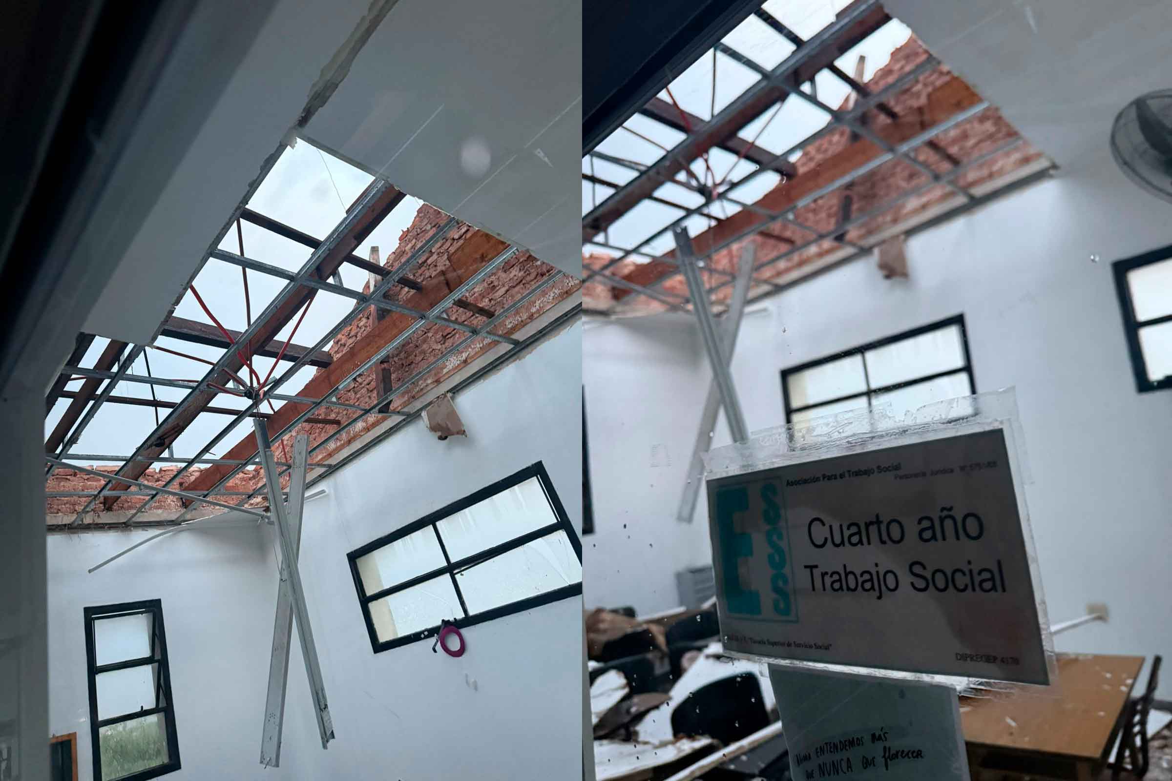 Por su parte, el secretario de Servicios Públicos, Genaro, brindó detalles del informe realizado tras el temporal: “Fue una tormenta muy fuerte, con ráfagas intensas y mucha agua en muy poco tiempo, lo que provocó la voladura de partes del techo en distintas áreas del Centro Universitario, como aulas y pasillos, y también daños en algunos inmuebles”, explicó.