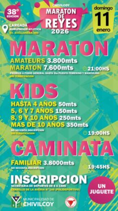 ste domingo 11 de enero se llevará a cabo la 38º edición de la tradicional Maratón de Reyes, organizada por la Agrupación Atlética en conjunto con la Municipalidad de Chivilcoy. Como cada año, la inscripción consiste en la donación de un juguete.