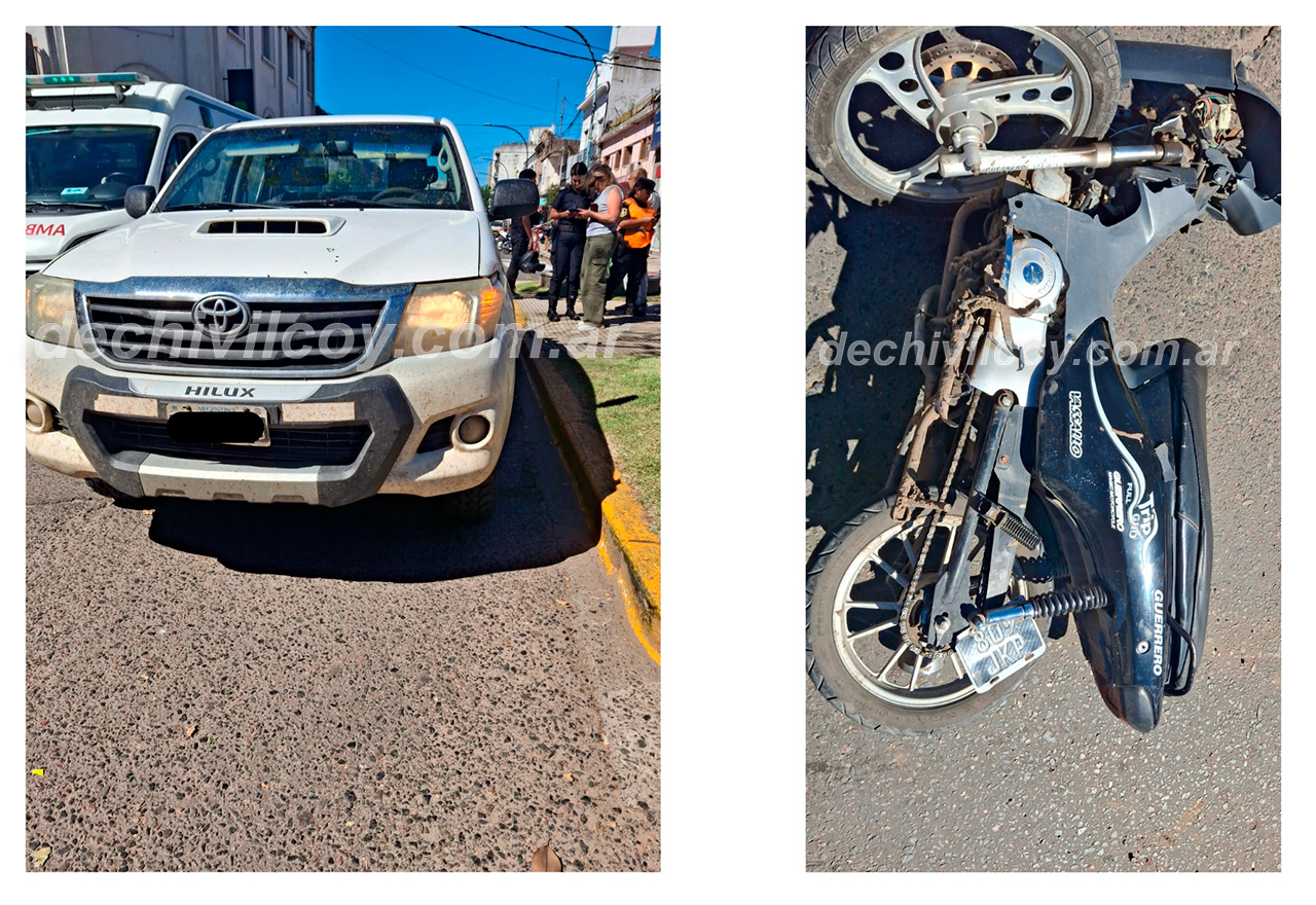 La camioneta Toyota Hilux conducida por Delia Ester Basso quien circulaba por calle Pellegrini es impactada en la parte de la caja del lateral izquierdo por una moto en la que circulaba un menor de 16 años de edad.