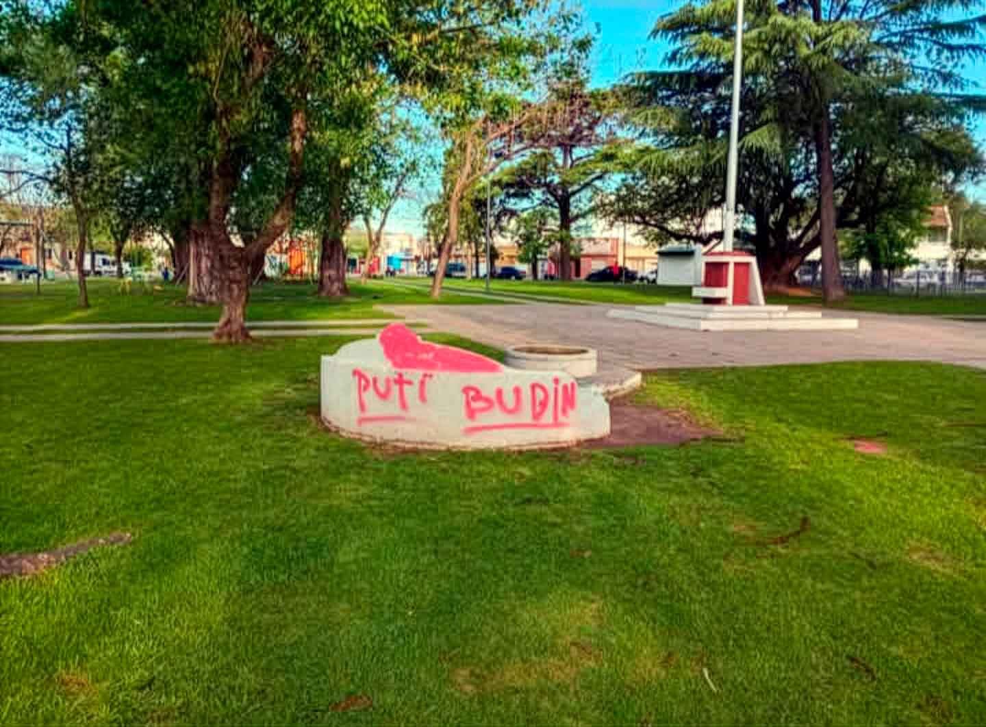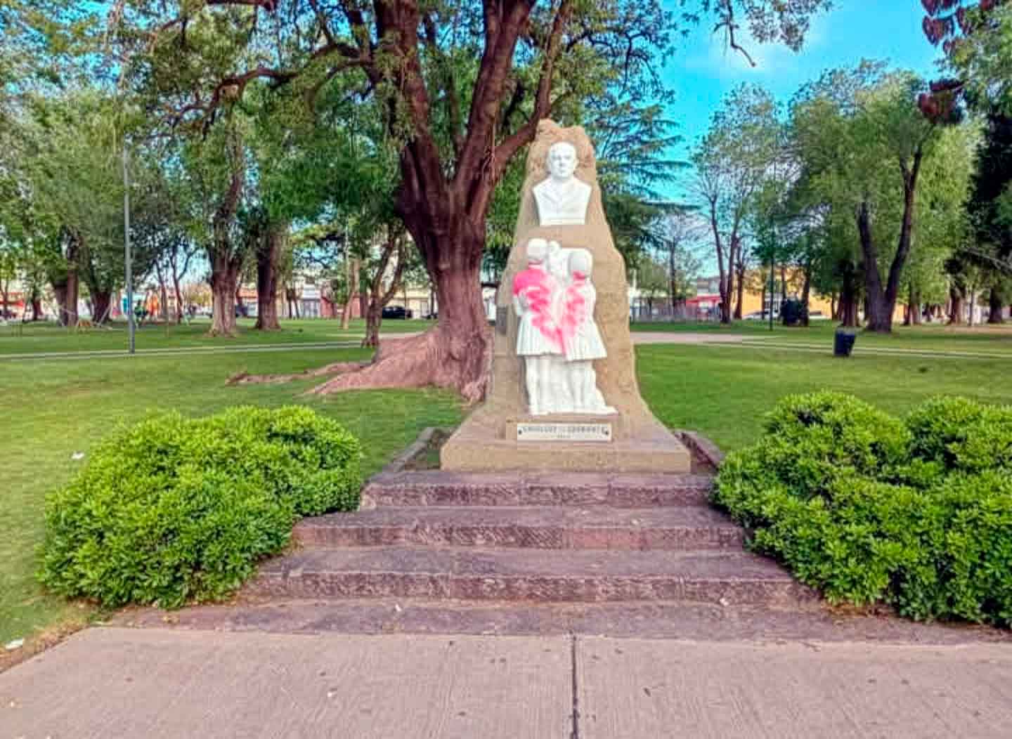 El monumento al prócer Domingo Faustino Sarmiento, junto a otros sectores del mobiliario urbano, fueron manchados con grafitis en pintura roja, dejando una huella visible del daño que estos actos generan en el patrimonio público.
