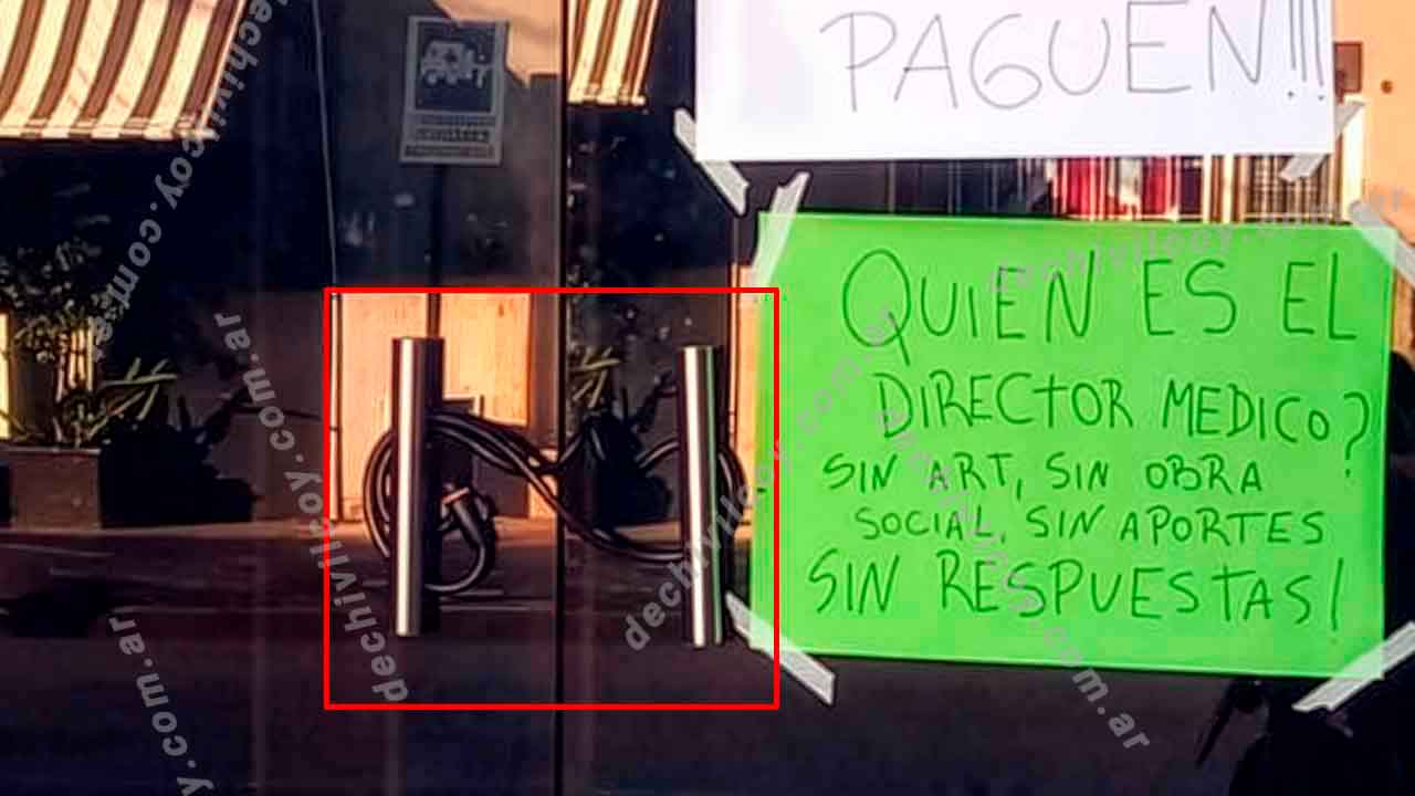En las últimas horas de la tarde de hoy, los trabajadores y quienes pasaban por el frente de la clínica, pudieron comprobar que la puerta de acceso principal se encuentra cerrada con un candado.