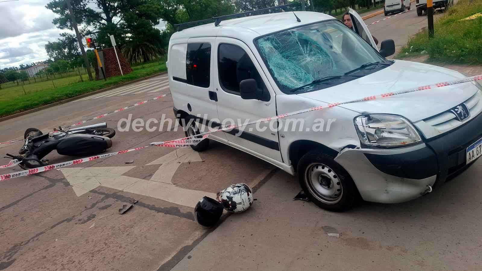 Un fuerte accidente de tránsito se registró este martes en la intersección del Acceso Raúl Alfonsín y la Ruta Nacional N°5, cuando una motocicleta en la que viajaban dos hermanos colisionó con un utilitario Peugeot Partner.